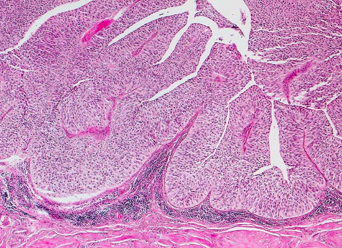 Das bedeckende Urothel des papillären Tumors ist deutlich verdickt. Verglichen mit normalen Urothel sind die Zellen dieses mässig differenzierten Tumors leicht vergrössert und hyperchromatisch. Dadurch erscheint das Epithel etwas dunkler als normales Urothel. Eine Stromainvasion ist nicht nachweisbar.