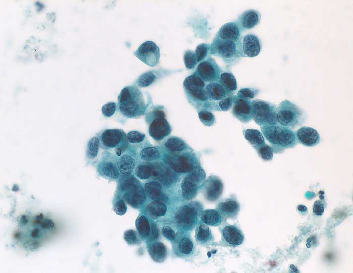 mit stark vergrösserten, polymorphen Kernen. Deutliche Erhöhung der Kern-Zytoplasma Relation. Grob gekörntes, teils stark verdichtetes und unregelmässig verteiltes Chromatin. Im Hintergrund Granulozyten und Detritus.