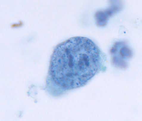 Urothelzelle mit stark vergrössertem Kern. Grob gekörntes und unregelmässig verteiltes Chromatin sowie gut sichtbare Nukleolen. Schmaler Zytoplasmasaum.
