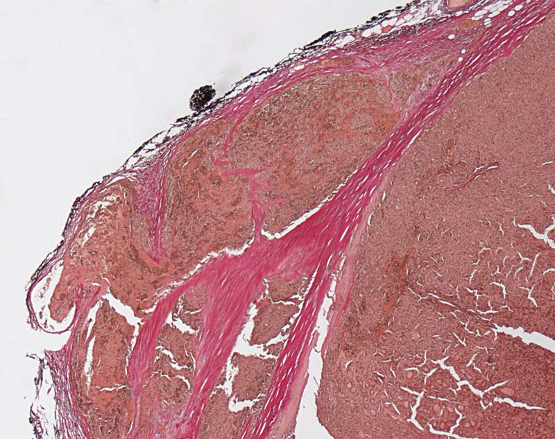 Der follikuläre Tumor hat die dicke bindegewebige Kapsel mehrfach durchbrochen und ist nur noch von einer sehr dünnen Neokapsel bedeckt, welche den mit schwarzer Tusche markierten Resektionsrand bildet.