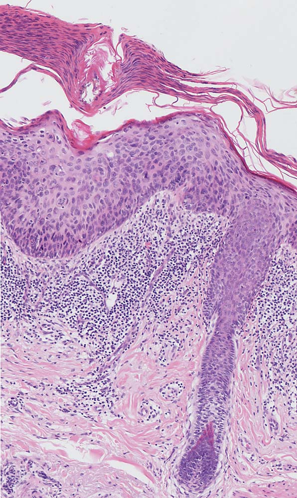 Hyper-parakeratotisch verhornende akanthotisch verbreiterte Epidermis. Dysplasie des Plattenepithels (vergrösserte hyperchromatische Zellkerne) auf der gesamten Epithelbreite unter Aussparung des Follikelepithels. Bandförmiges Entzündungsinfiltrat in der dermoepidermalen Junktionszone.