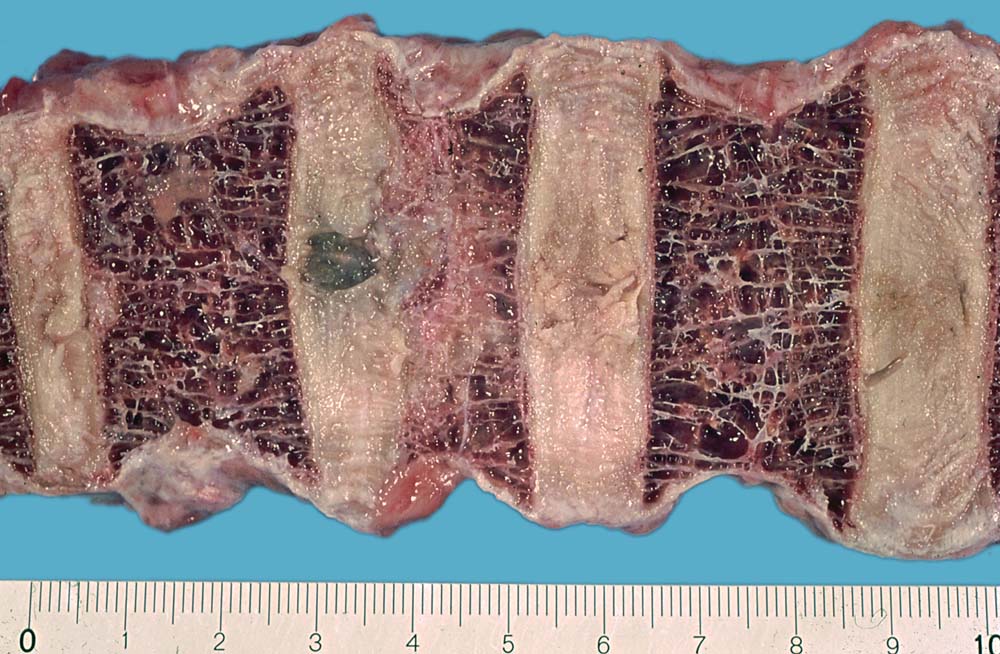 Rarefizierung der Spongiosabälkchen mit Akzentuierung der Längsbalken bei schwerer Osteoporose. Verschmälerung des mittleren Wirbelkörpers nach Kompressionsfraktur.