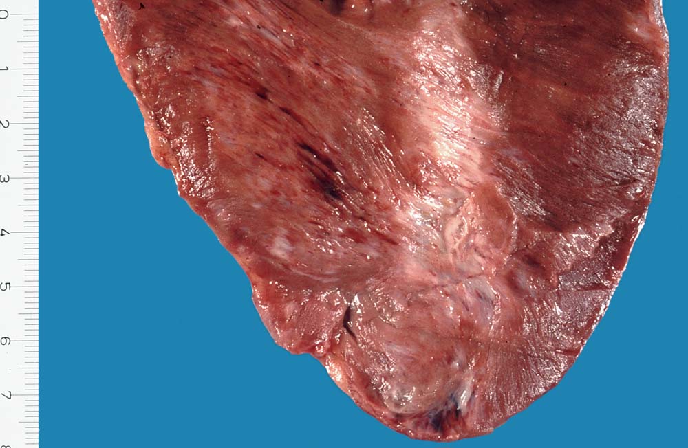 Narbenzone im Übergangsbereicht von Septum zu Hinterwand und grobfleckige Fibrose des Septums.