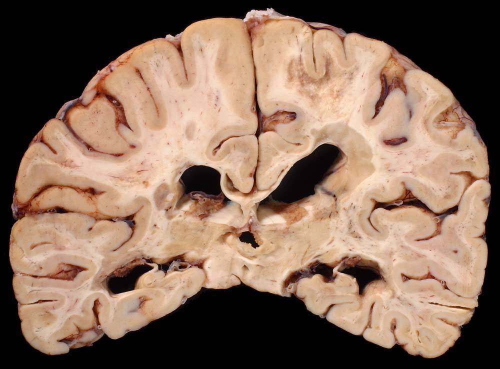 Periventrikulär betonte fleckförmige Grauverfärbung des Marklagers ( Entmarkungsareale).