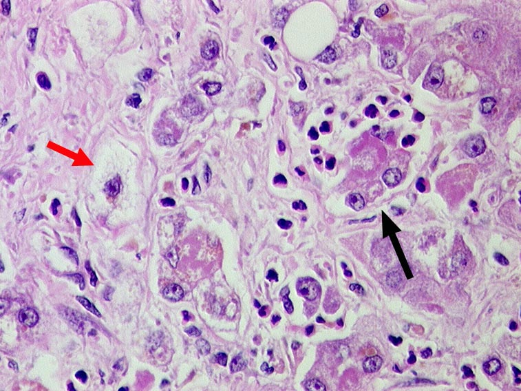 Mehrere Hepatozyten enthalten wurstförmige eosinophile ► Mallory-Denk Körperchen im Zytoplasma. Neutrophile Granulozyten reihen sich satellitenartig um einzelne Hepatozyten mit Mallory-Denk Körperchen. Ein Teil der Leberzellen ist ► hydropisch geschwollen und verfettet.