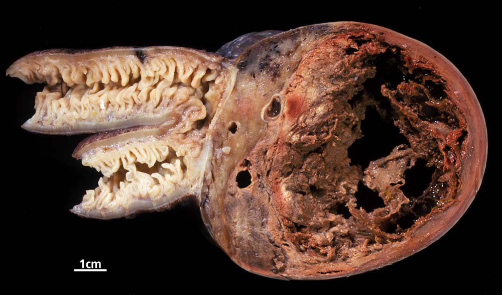 Kugeliger Tumor mit ausgedehnten Nekrosen ausgehend von der muskulären Darmwand.