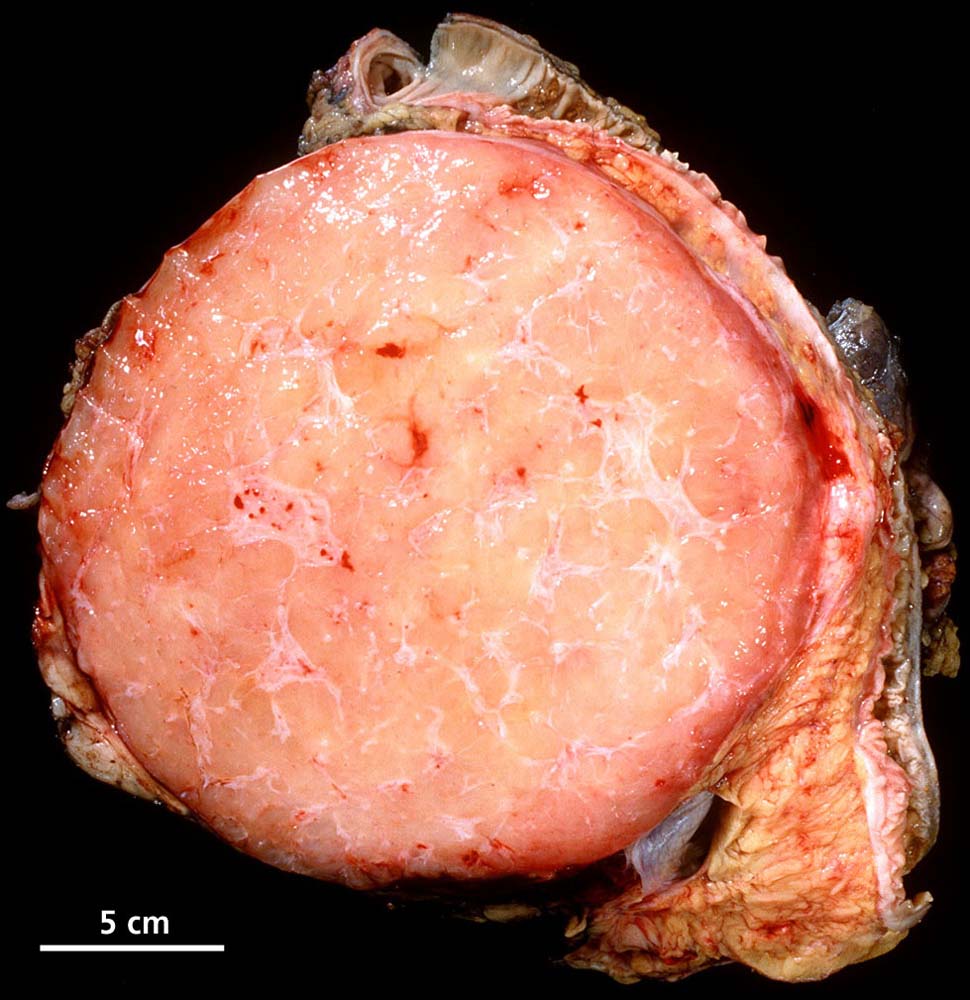 Weitere Tumorknoten, von denen makroskopisch ein Teil keine Ähnlichkeit mit Fettgewebe besitzt. Histologisch dedifferenziertes Liposarkom mit gut differenzierten lipomähnlichen Liposarkomanteilen.