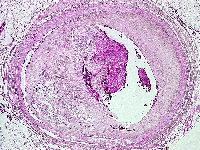 Transmuraler akuter Myokardinfarkt bei Deckplattenaufbruch des RIVA mit Thrombose.