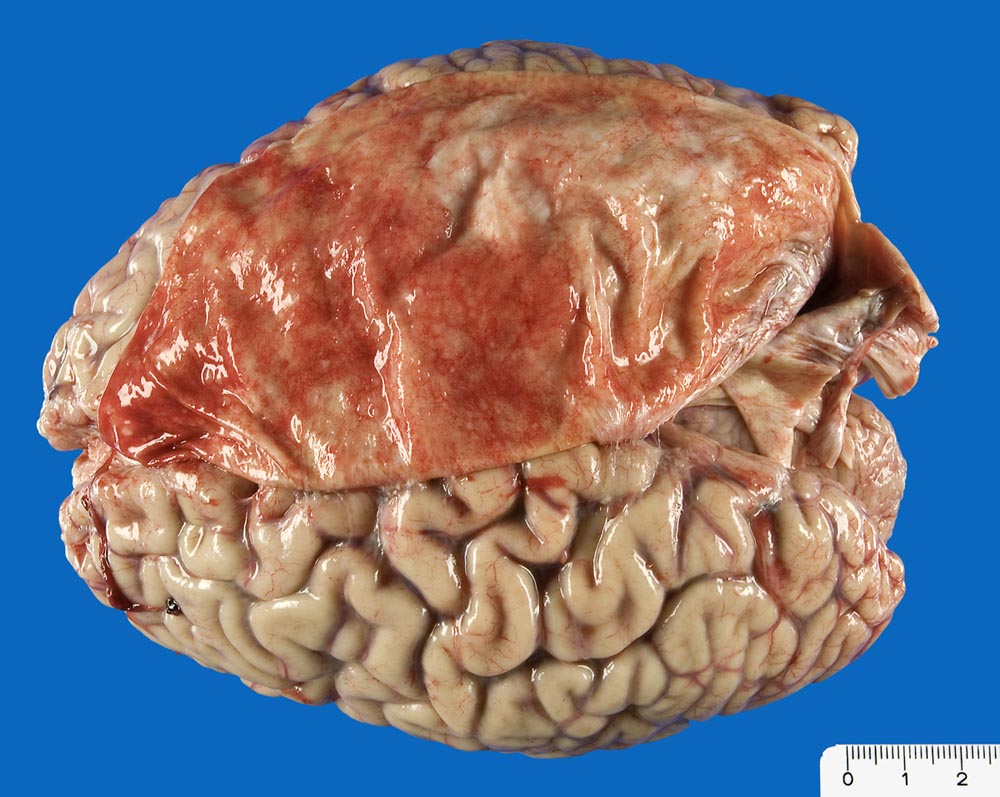 Starke Gefässhyperämie der weichen und harten Hirnhaut. Meningeosis carcinomatosa: zahlreiche weisse flache Knötchen.