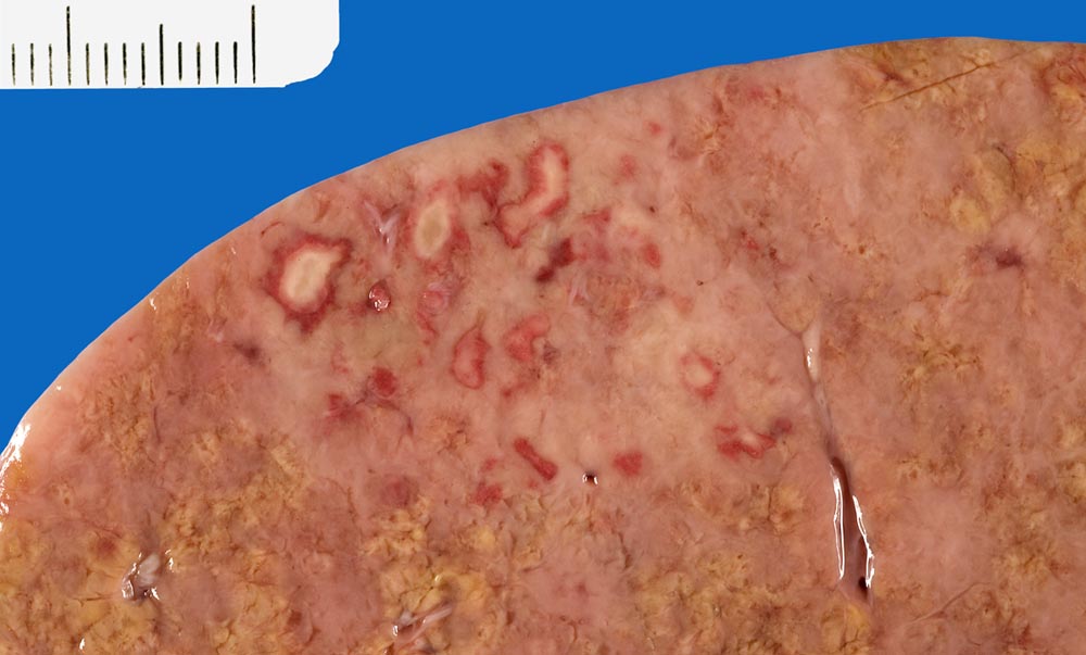 Diffuse Durchsetzung des Leberparenchyms mit Metastasen. Frische Tumornekrosen mit hämorrhagischem Randsaum.