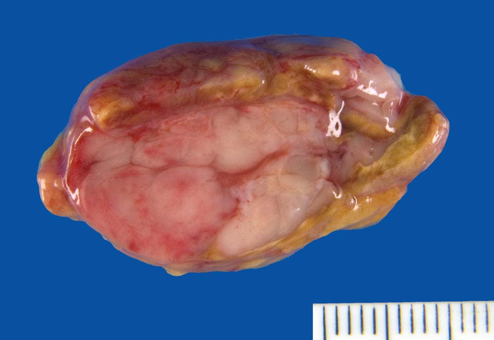 Autoptisch: Infiltration des Knochenmarks mit osteolytischen Herden im 5. Lendenwirbelkörper, Rippen, Beckenkamm, Sternum. Infiltration der Lunge links mit Schwerpunkt im Unterlappen, Infiltration der Pleura visceralis und parietalis links und der Pleura visceralis rechts. Seröse Pleuraergüsse (links: 3.3 l, rechts: 0.9 l). Mediastinaler Tumor (Dm 10cm) mit Übergreifen auf die Brustwand. Perikardinfiltraton. Infiltrate in Leber (Dm bis zu 3.5cm), Milz, Haut (Dm bis zu 0.8cm), Peritoneum, Nebenniere links, peripankreatische Lymphknoten, perirenales Weichteilgewebe.