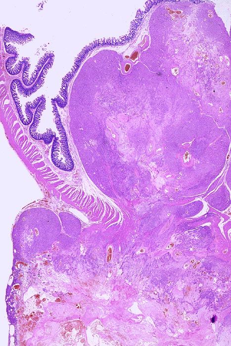 Teils zystischer von der Submukosa ausgehender scharf begrenzter Tumor mit Infiltration bis in das subseröse Fettgewebe. Die Mukosa über dem Tumor ist intakt.